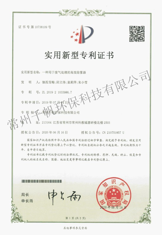 實(shí)用新型專(zhuān)利證書(shū) 一種用于廢氣處理的高效除霧器